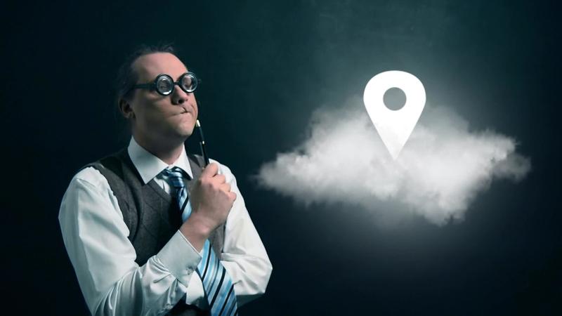 lustiger Nerd oder Geek, der fliegende Wolke mit rotierendem Ortssymbol sucht Kostenloses Video