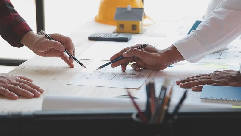 Konstruktions- und Strukturkonzept des Ingenieur- oder Architektentreffens für die Projektarbeit mit Partner- und Ingenieurwerkzeugen zum Modellbau und zur Blaupause auf der Baustelle, Vertrag für beide Unternehmen. Kostenloses Video