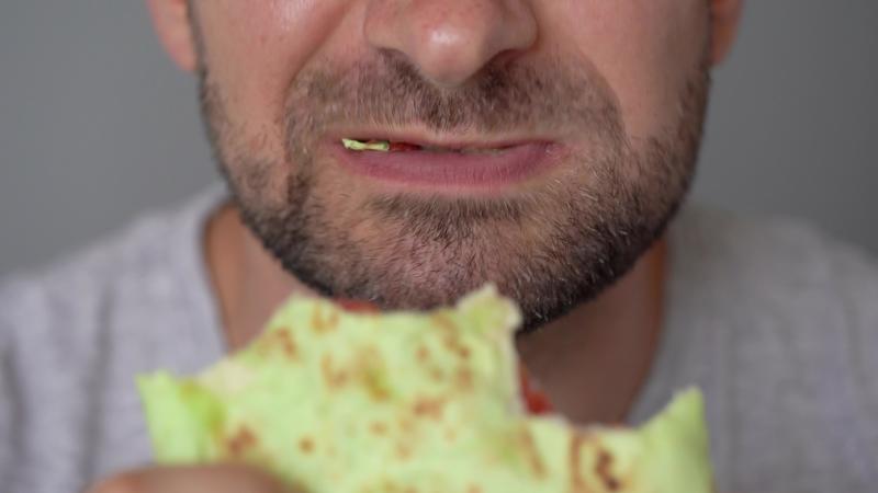 Mann Essen Spinat Döner mit Hähnchen und Gemüse Nahansicht Pro Video