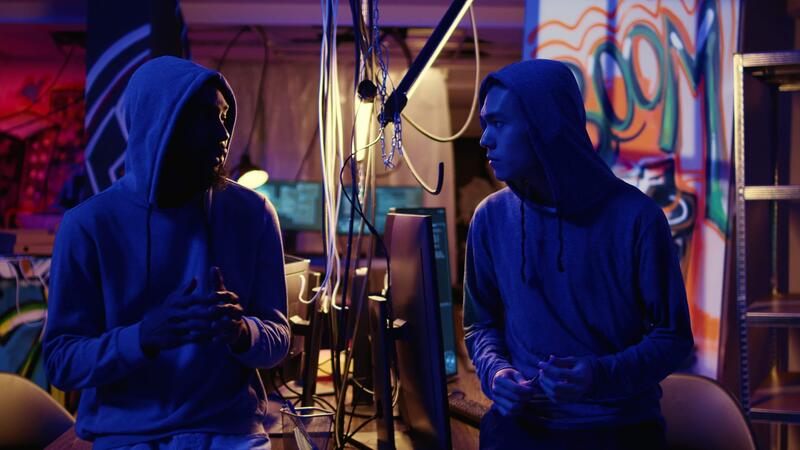 Teamarbeit Hacker im Graffiti gemalt unter Tage hq diskutieren Fortschritt auf Spyware Software Entwicklung benutzt zum Versammlung Information von Benutzer Computers, Brainstorming Wege zu gehen unentdeckt Pro Video