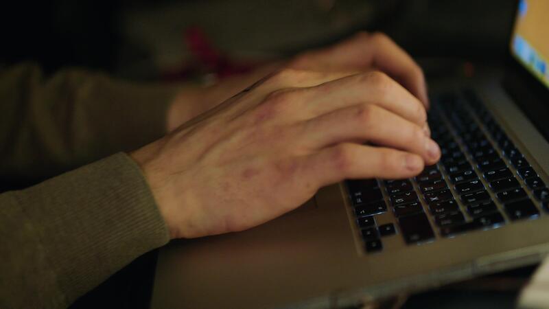 schließen oben von männlich Hände Tippen Text oder Programmierung Code im Computer im natürlich Umgebungs Licht beim spät Abend. Lager Pro Video