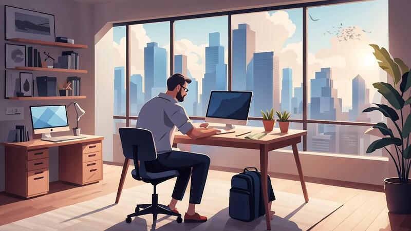 ai generiert ein Mann sitzt beim seine Schreibtisch Arbeitsplatz mit seine persönlich Desktop Computer Arbeiten online Programm im Arbeit beim Zuhause Konzept Pro Video