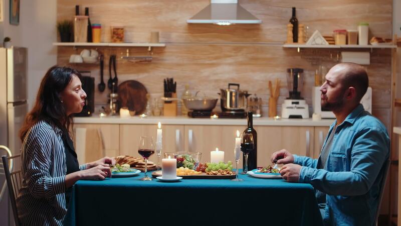 jung glücklich verheiratet Paar haben Video Anruf im Küche während romantisch Abendessen, Essen festlich Mahlzeit. pov online Internet modern Konferenz, chatten, Kommunikation, Plaudern Konversation Anruf über Webcam Pro Video