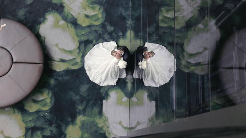 Braut und Bräutigam im das Hotel oben Sicht. das Bräutigam Küsse das Braut. Pro Video