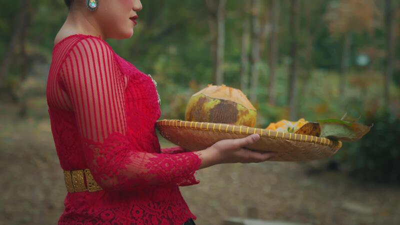 Person im traditionell Kleidung halten Kokosnüsse auf ein gewebte Tablett Pro Video