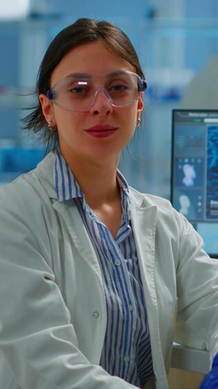 Vertikale . Chemiker mit Labor Mantel Sitzung im Labor suchen beim Kamera lächelnd, während Kollege Arbeiten auf Computer im Hintergrund. Wissenschaftler Prüfung Virus Evolution mit hoch Technik zum wissenschaftlich Forschung Pro Video