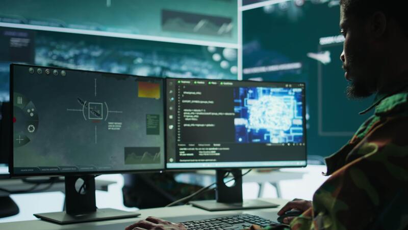 Internet-Sicherheit Experte überwacht Intelligenz Versammlung durch ai Gehirn Visualisierung und neural Netzwerk, Algorithmen zu sammeln echt Zeit Daten von Überwachung Systeme. Digital Wissenschaft. Kamera b. Pro Video