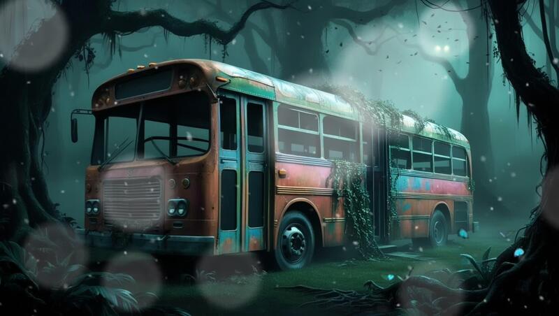 ein verlassen Bus, bewachsen mit Reben, sitzt unheimlich im ein nebelig Wald beim Nacht, beleuchtet durch ein Unbekannt Licht Quelle. das Szene ist Spuk und mysteriös, hervorrufen ein Sinn von Vergessene Geschichten. Pro Video