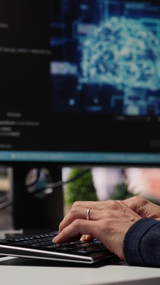 Vertikale cto Manager im ai konzentriert Anfang Entwerfen, Codierung und Debuggen Anwendungen im anders Software Sprachen. Chef Techniker Offizier tun Code testen und Qualität Sicherheit, Kamera b schließen oben Pro Video