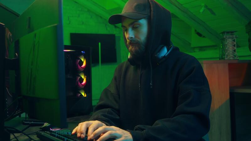 kaukasisch Mann Tippen Tastatur Computer Desktop pc online Cyber Verbrechen virtuell Netzwerke Browser Programmierer Codierung Monitor Benutzer in Verbindung gebracht E-Commerce Freiberufler männlich Kerl Internet Netz Cyberspace Technologie Pro Video