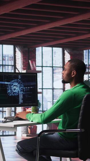 Vertikale afrikanisch amerikanisch Techniker schreibt Code auf ai Gehirn neural Netzwerk zum Maschine Lernen, tun Instandhaltung und Debuggen das Software Systeme. es Experte Verwendet Programmierung Sprache. Kamera b. Pro Video