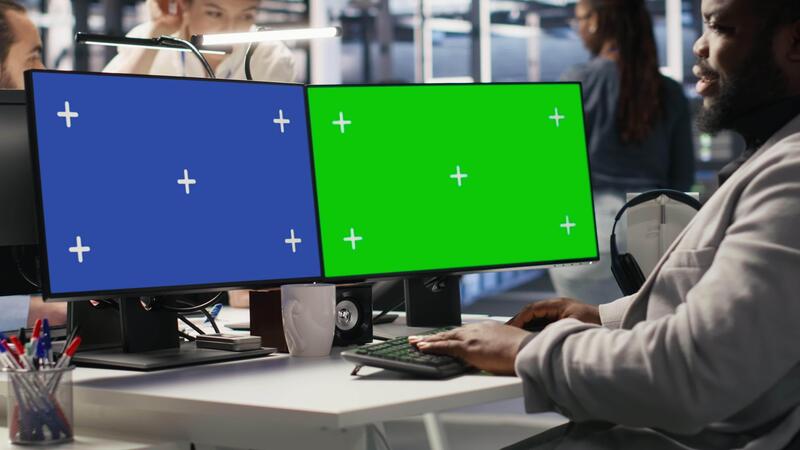 Daten Center Software Entwickler inspizieren Ausrüstung mit isoliert Bildschirm PC, tun Instandhaltung Aufgaben. Server Zimmer es Spezialist mit Attrappe, Lehrmodell, Simulation Computer, Dirigieren System Schecks, schließen oben Pro Video