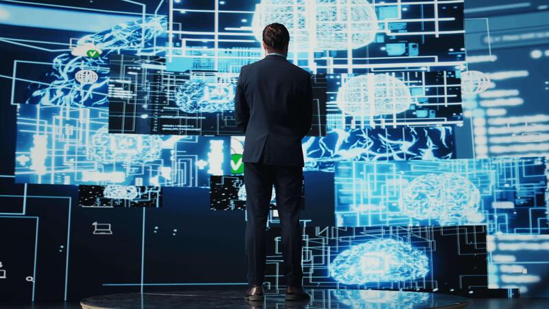 Fachmann Führer suchen um beim ai neural Netzwerke System, anstellen Digital Gehirn Visualisierung zum Maschine Lernen und Programmierung. Clever Technologie und algorithmisch Denken. Kamera b. Pro Video