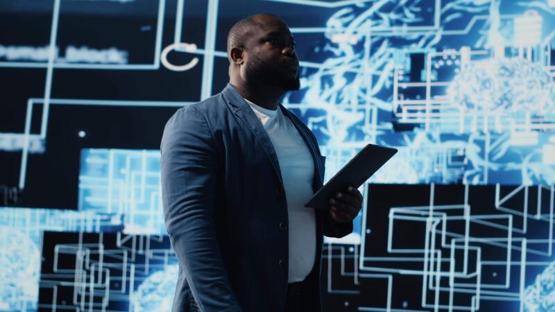 jung schwarz Techniker Überprüfung ai Daten Visualisierung und neural Netzwerke Plattformen, Clever Technologie Cyberspace Systeme. Studien Maschine Lernen, Wolke Computing und Algorithmen Kamera b. Pro Video