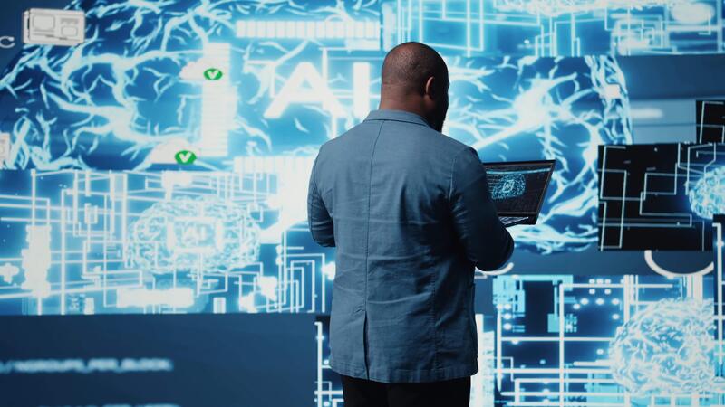 Technik kapieren schwarz Ingenieur Arbeiten mit ai Gehirn Daten Visualisierung, illustrieren Computer Wissenschaft und Automatisierung Werkzeuge zum tief Lernen. Umsetzung neural Netzwerke Systeme. Kamera a. Pro Video