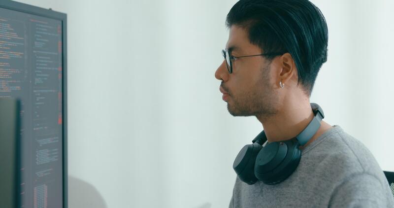 Nahansicht jung Asien männlich freiberuflich Tippen schreiben prompt ai bot es App Programm Nomade, Spiel, Terminal mit Kodierung, Benutzer Schnittstelle, Designer, groß Daten Center auf Desktop Computer. Pro Video