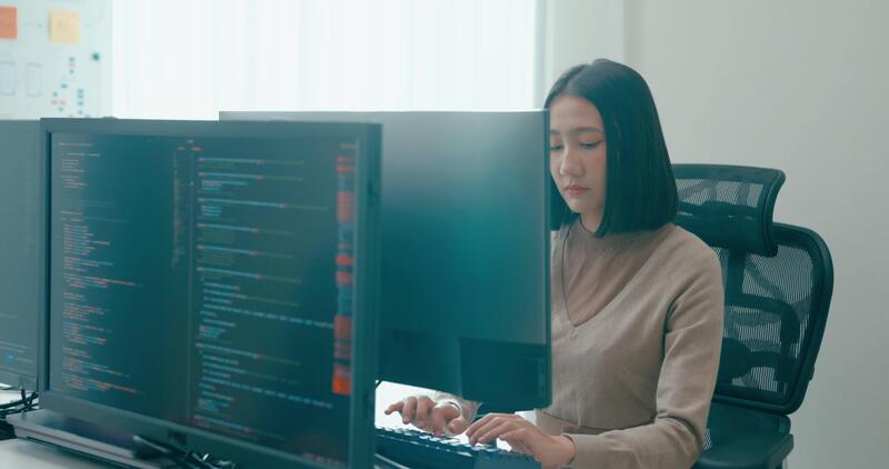 Gruppe Erwachsene Asien männlich, weiblich freiberuflich Tippen schreiben prompt ai bot es App Clever Programm Nomade, Spiel, Terminal mit Codierung Sprache, Benutzer Schnittstelle, Designer, groß Daten Center Desktop Computer. Pro Video