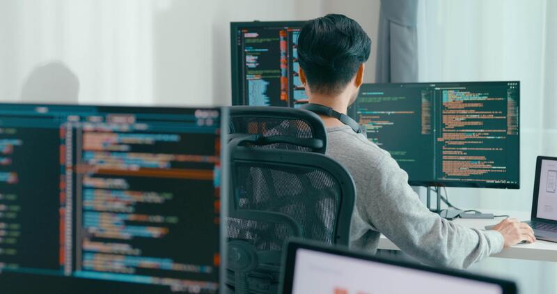 Gruppe Erwachsene Asien männlich weiblich freiberuflich Tippen schreiben prompt ai bot es App Clever Programm Nomade, Spiel, Terminal mit Codierung Sprache, Benutzer Schnittstelle, Designer, groß Daten Center auf Desktop Computer. Pro Video