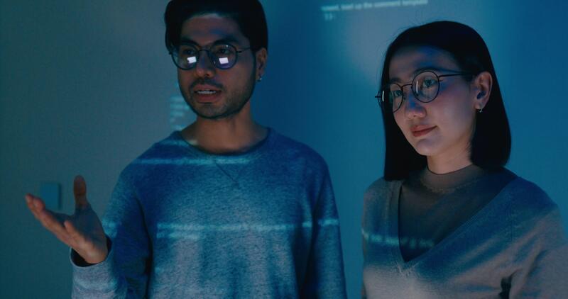 Gruppe Asien männlich weiblich Software Entwickler Mentor Führer Manager sich unterhalten Strategie planen zu Exekutive schreiben prompt ai es App Programm Nomade, Spiel, Daten Center. Projektion Code. Pro Video
