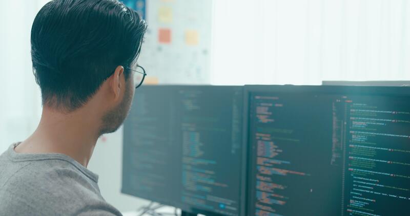 Nahansicht jung Erwachsene Asien männlich freiberuflich Brille Tippen schreiben prompt ai bot es App Programm Nomade, Spiel, Terminal mit Kodierung, Benutzer Schnittstelle, Designer, groß Daten Center auf Desktop Computer. Pro Video